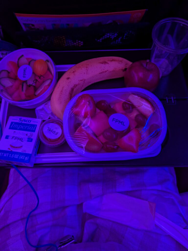 We left from California in the evening, around the children’s bedtime, with hopes that they would sleep on the 10-hour flight to London. Thankfully, that was the case and our flying time was filled with “restless dozes” as my 7-year-old put it. 🙂 We grabbed some salad and protein from a Farmer’s Fridge in the airport and ate that along with a full fruit platter for our on-flight meals… it was pretty good!